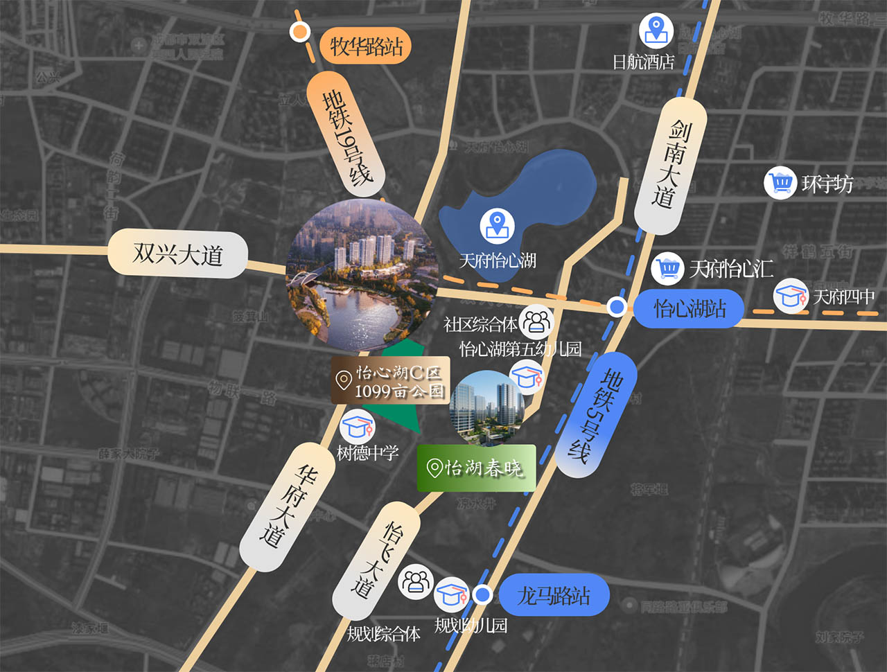 踞守怡心湖核心区,三公里内坐拥三地铁(5号线/6号线/19号线),配合四纵三横快速路网,无缝衔接主城繁华,以“出则繁华、入则静谧"的姿态,成为成都南向发展的封面级资产。