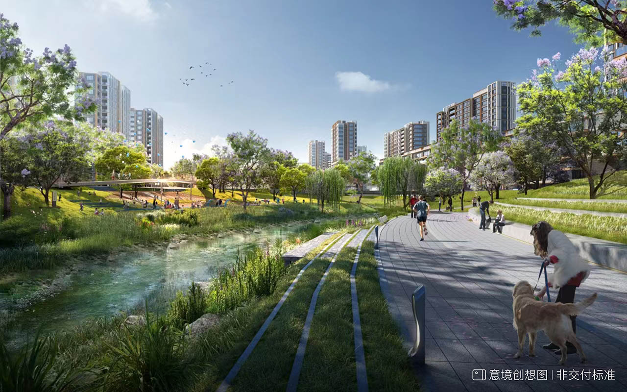 园内打造约1km溪谷水岸、约1.5km蓝花楹大道、约3.9km公园式归家步道。